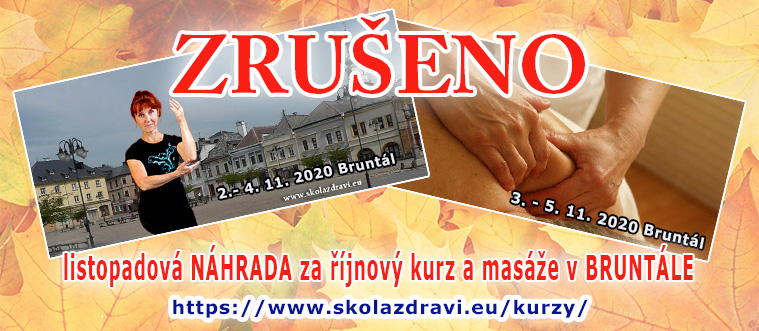 - Bohužel v této pokračující obtížné době v boji s nákazou koronavirem COVID-19, z důvodů mimořádných opatření a ochrany zdraví nás všech jsme nuceni oficiálně zrušit podzimní náhradní docházkový kurz od 2. – 4. 11. 2020 a masáže od 3. – 5. 11. 2020 v Bruntále. Po dohodě s organizátorkou Danou Meca Frankovou a přečtení vydaných nařízení platící v pokračujícím nouzovém stavu a současném zpřísněném rezimu, nelze nic provozovat.