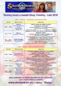 Máte možnost stáhnout aktualizovaný Časový rozpis všech kurzů, seminářů a masáží do konce roku 2018 s krátkými popisy v barevné tiskové podobě, také něco o paní Eleně Tomilině a produktech Školy zdraví. Najdete vše ke stažení v patičce našich stránek rubrika “Ke staženi”.