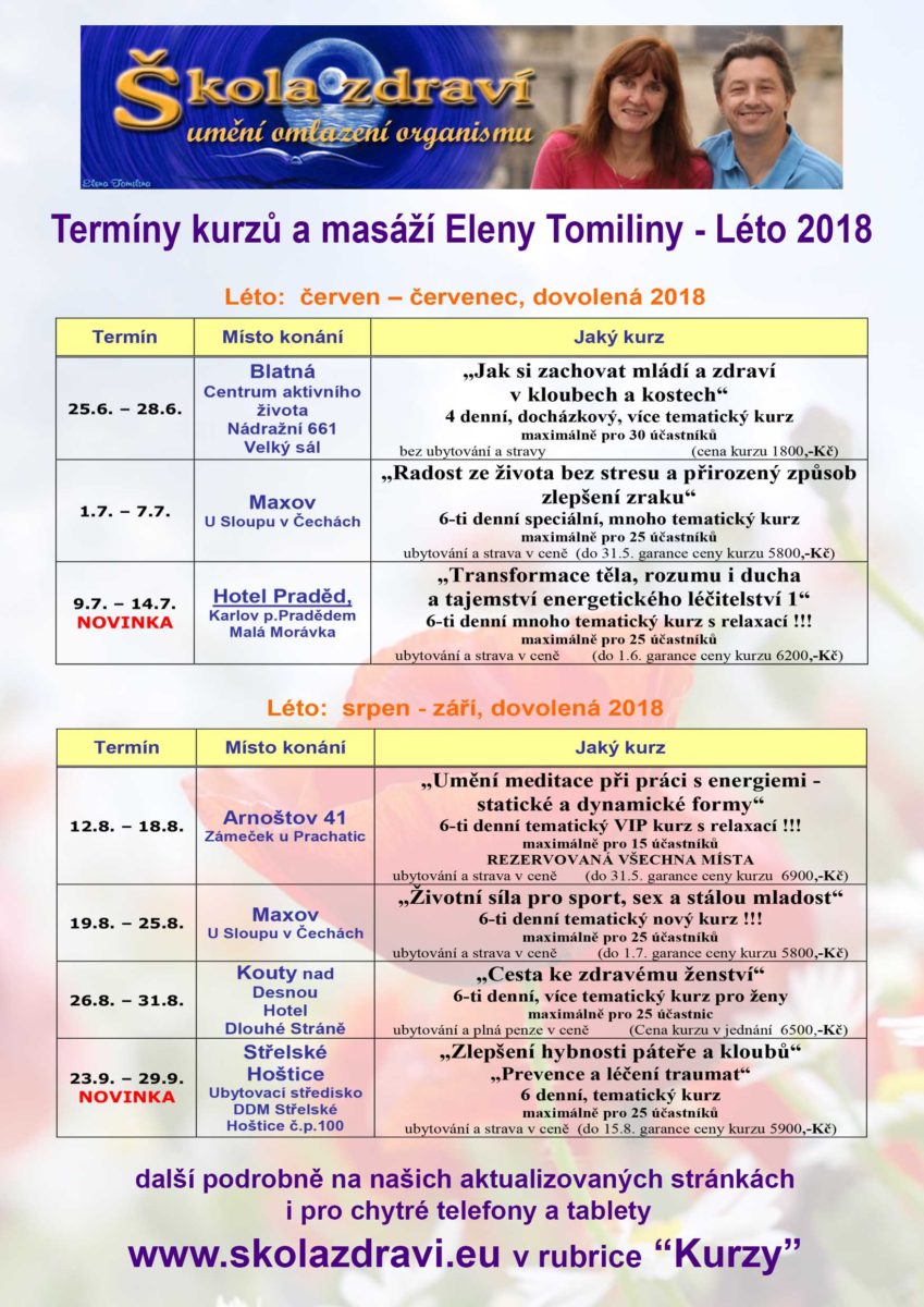 Dnes Vám přinášíme ucelený obrazový přehled všech připravovaných kurzů, seminářů na Léto 2018 tak, jak je v této formě najdete na našich aktualizovaných stránkách pro počítače, tablety i mobily na www.skolazdravi.eu v rubrice “Kurzy”. Také tam najdete, kdy u některých kurzů končí garantovaná cena a do kdy je nutné uhradit zálohu pro přijetí na pobyt.