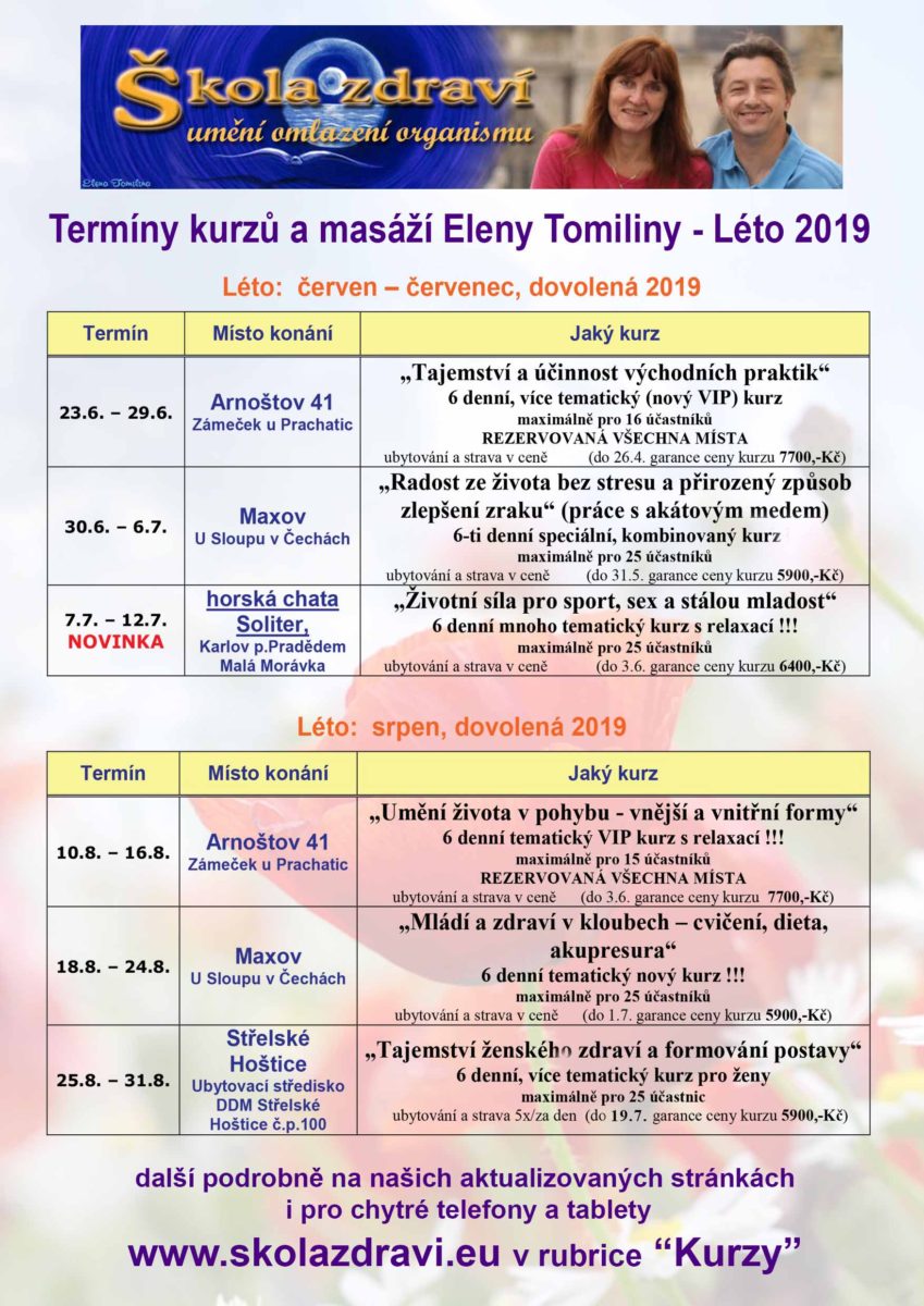 Máte možnost stáhnout aktualizovaný Časový rozpis všech kurzů, seminářů a masáží do konce roku 2019 s krátkými popisy v barevné tiskové podobě, také něco o paní Eleně Tomilině a produktech Školy zdraví. Najdete vše ke stažení v patičce našich stránek rubrika “Ke staženi”.