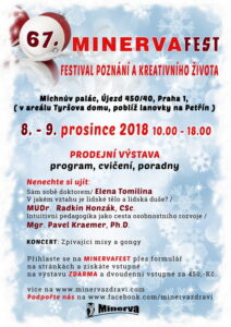 Dále vás na MinervaFest čeká příjemný maraton zajímavých přednášek, seminářů a workshopů, které budou probíhat po celou sobotu a neděli souběžně ve třech sálech. K tomu celou sobotu a nedělní dopoledne na vás navíc čeká pestrá nabídka zdravotního a energetického cvičení v tělocvičně.