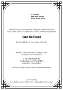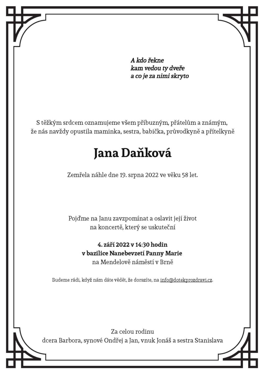 S velkou lítostí vyjadřujeme upřímnou soustrast pozůstalým. Elena Tomilina a já, Leoš Lacina jsme spolu s ostatními doslova zaskočeni touto zprávou. Jana Daňková, která ještě od 24.7.-30.7. absolvovala pobytový ozdravný kurz Školy zdraví Eleny Tomiliny, aby se opět zregenerovala, nabrala energii, naučila se něco nového z cvičení a masáží, které by mohla předávat dál svým klientům, najednou není. Náhlá smrt je pro nás nepochopitelná, protože Jana s námi jezdila několikrát do roka vždy s optimismem a dobrou náladou aby pečovala o své zdraví. Naše kurzy se jí velmi líbily. Vždy si na ní na každém kurzu vzpomeneme. Jani, jsi navždy zapsaná v našich srdcích…..