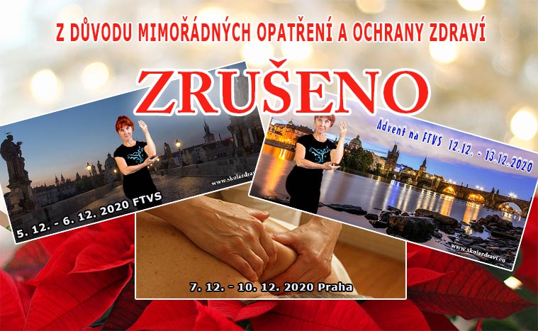 - Bohužel v této pokračující obtížné době, z důvodů mimořádných vládních opatření, rozšiřujících opatření, stále uzavřené Fakulty tělesné výchovy a sportu a ochrany zdraví nás všech jsme nuceni oficiálně zrušit i prosincové kurzy od 5. – 6. 12. a od 12. – 13. 12. 2020 a masáže od 7. – 10. 12. 2020 v Praze. Po dohodě s pronajímatelem tělocvičny na FTVS a ubytovacím zařízením a současných vydaných nařízení (PES) platící v pokračujícím nouzovém stavu a současném zpřísněném režimu, nelze nic bez velkého omezení provozovat. Taktéž se veškerá omezení vztahují na masáže. Všem oficiálně přihlášeným na kurzy případně na masáž pošleme informační mail o zrušení.